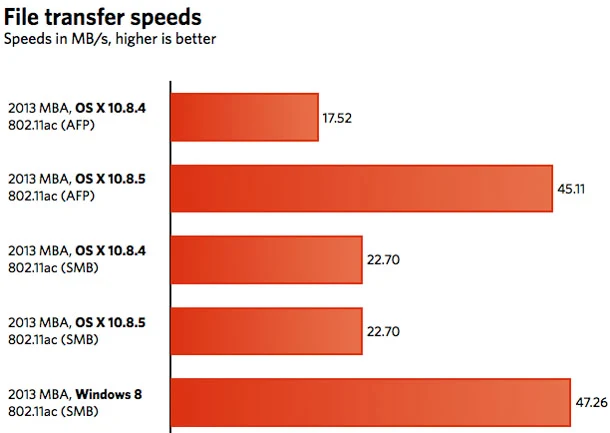 這次的 Mountain Lion 系統重大更新,有國外媒體測試,AFP 文件在 802.11acWi-Fi 環境下傳輸的速度提升兩倍。另外 OS X Mountain Lion 10.8.5 更新還包括:修復了郵件有時不能顯示訊息問題、提高了 Xsan 的穩定性,和改善在 Open Directory 服務器裡進行驗證的性能。