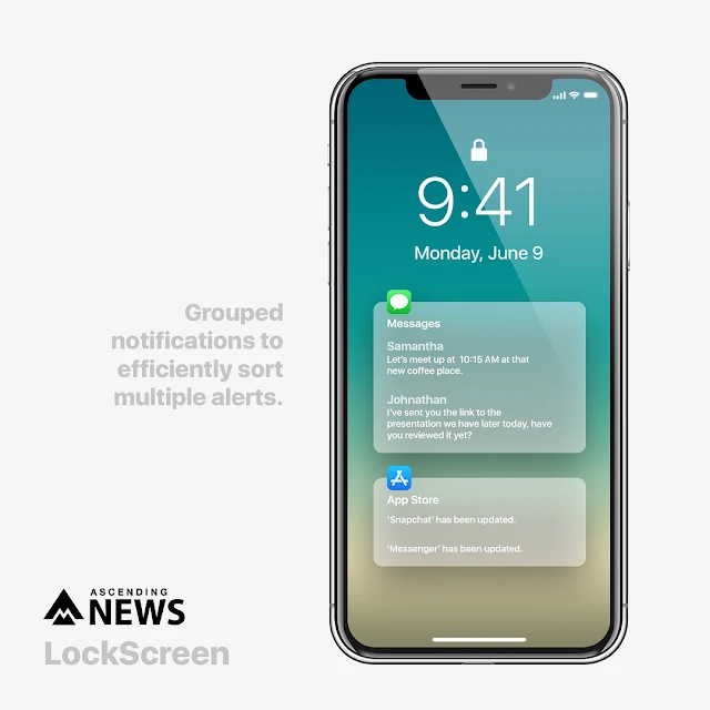 這款由 Instagram 用戶 ascendingnews 推出的 iOS 12 概念設計,擁有簡化的用戶界面使設計更清潔更美觀。並提出了鎖機畫面通知分類和 Always on 時間、天氣顯示想法,能將小插件顯示在鎖機狀態。在 OLED 螢幕的 iPhone 上,能以黑白和低素像模式來進一步節省電力。